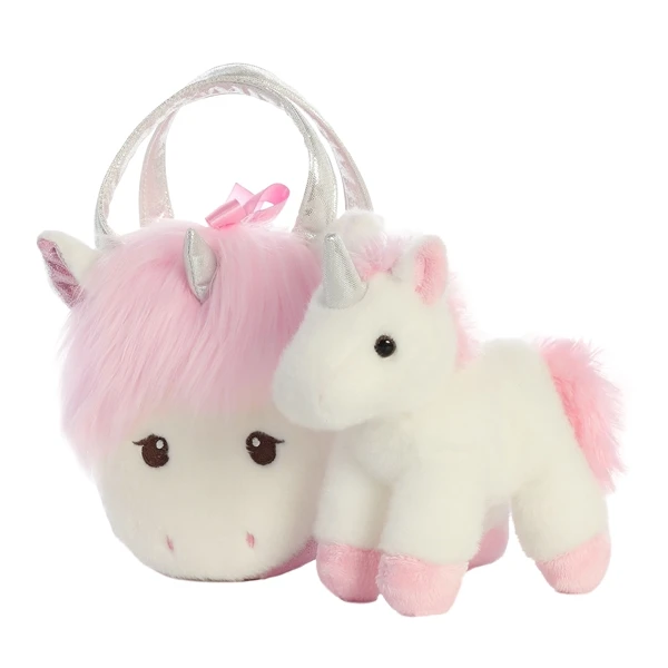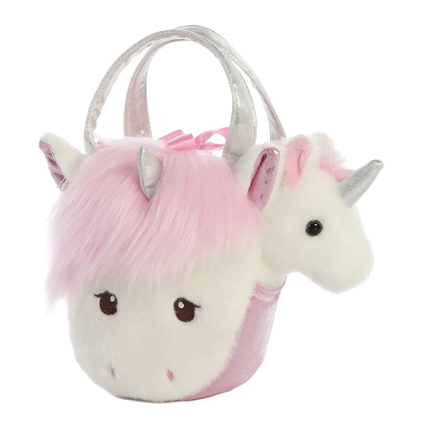 Even magical creatures get tired sometimes, which is why this plush unicorn comes with her very own carrier. Measuring approximately 7 inches, the Fancy Pals Plush Tulip Unicorn with Bag by Aurora includes a super soft, cloud-white stuffed unicorn, with fluffy pink hooves, mane, and tail, and a beautifully sparkly magical silver horn. Filled with recycled plastic bean pellets and a soft fiber fill, she has a wonderfully floppy feel to her, which makes cuddling her a dream come true. The Fancy Pals Plush Tulip Unicorn with Bag by Aurora also comes with a stunning pet carrier. Shaped like a unicornÂ’s face, this bag has embroidered facial details, shimmering pink ears, and the same sparkling silver horn, with a pair of soft handles to match. Suitable for believers aged 3+, the Fancy Pals Plush Tulip Unicorn with Bag by Aurora can also be used as two separate toys, so while the unicorn stuffed animal is busy making magic (and occasional mayhem, because she is only young, after all), you can slip the bag onto your arm and use it while you go to look for four leaf clovers and golden pots at the end of the rainbow.