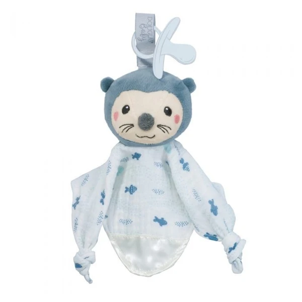 You’ll ‘seaÂ’ the absolute joy on your babyÂ’s face every time they catch sight of the adorable Indy Otter Plush Pacifier Holder Lovey by Douglas. In a gorgeous deep slate blue color, this plush otter pacifier holder measures around 8 inches, and will give your baby a best friend to cuddle and babble to, while also keeping their pacifier close at hand at all times. The delightful face on the Indy Otter Plush Pacifier Holder Lovey by Douglas is made from a luxurious plush fabric, with baby-safe embroidered features to give Indy a sweet expression on his cream face – along with rosy cheeks and lovable whiskers – while his body is made from 100% cotton muslin. Printed with an all-over blue and white fishy design, the muslin square also boasts two soft satin corners and two knotted ones to give baby ample textures to explore. There is an all-important hook and loop strap on top of this stuffed otter pacifier holderÂ’s head to keep your babyÂ’s binkie safe and sound, and when theyÂ’re not using their pacifier, it will be easy to find in the diaper bag or purse. A delightful gift thatÂ’s a little bit different from the more usual teddies and toys, the Indy Otter Plush Pacifier Holder Lovey by Douglas is also machine washable, because even Indy enjoys a dip in the water every now and again.