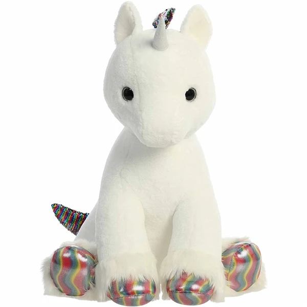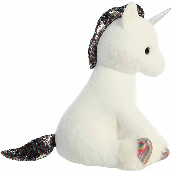 Aurora World Inc. is one of the world’s most popular plush companies with over 25,000 retail outlets worldwide. Their products can be found in major zoos, department stores, gift shops, and at StuffedSafari.com, of course! Aurora stuffed animals are incredibly well made with a focus on durability, safety, and most importantly, cuteness. As with all products by Aurora, the Jumbo Sitting White Plush Unicorn with Reversible Rainbow Sequins by Aurora is made with all new, child safe materials and meets or exceeds all U.S. safety standards. Recommended for ages three and up, we suggest surface washing for this jumbo sitting unicorn plush animal with rainbow sequins.