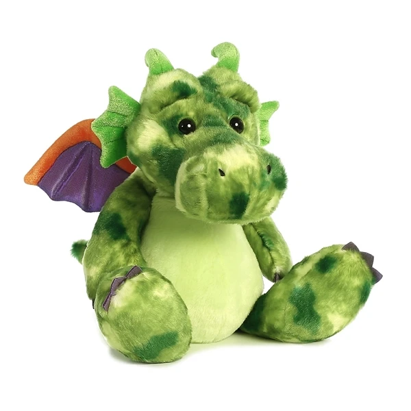 If you’re looking for a pet dragon then look no further. Ohen Gentleheart the Green Dragon Stuffed Animal by Aurora is the perfect fire-breathing friend! We’ll supply the plush green dragon and your imagination can supply the fire, of course. Connecting you with this awesome green dragon stuffed animal is our job. After that the magical adventures, heroic rescues, and all kingdom saving activities are between you and your new best friend. Ohen Gentleheart has soft green plush with random light green spots and a light green belly. Shiny accents decorate Ohen Gentleheart’s claws and the underside of his purple and orange wings. This is one fine looking dragon! We’re not sure of the dragon’s age. Maybe he’s a baby or maybe he is full grown. You’ll have to determine that yourself. He might also be a she. You can create your own backstory for this green dragon stuffed animal, the possibilities are limitless and incredibly exciting. In the sitting pose, Ohen Gentleheart measures nine inches tall and nine inches long including the cool dragon tail. It is five inches wide at the belly and has big floppy feet. This happens to be the perfect size for taking your stuffed green dragon with you on all kinds of adventures and quests. Just be careful, having a fire-breathing friend can be a big responsibility!