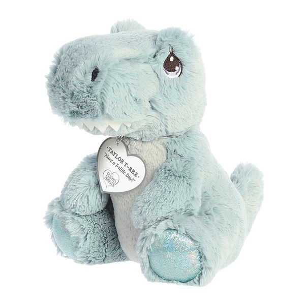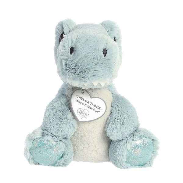 You wonÂ’t find the Precious Moments Taylor T-Rex Stuffed Animal Dinosaur by Aurora in any old dino-store, because only the very special ones sell cuddly dinosaurs as roarsome as this. At around 8.5 inches, this plush dinosaur will get every day off to an awesome start, thanks to the message he carries around his neck. Soft and fluffy, the Precious Moments Taylor T-Rex Stuffed Animal Dinosaur by Aurora is a delightful pale aqua blue color, with a lighter color tummy and teeth, while the bottoms of his feet shimmer and shine for a bit of added glam. ItÂ’s his eyes that give him away as a Precious Moments plushie, though; huge and teardrop-shaped, these peepers are embroidered to ensure this stuffed dinosaur is safe for even the newest of babies. Stuffed to perfection, the Precious Moments Taylor T-Rex Stuffed Animal Dinosaur by Aurora contains a soft fiber fill thatÂ’s eco-friendly, offering comfort to you when you need a hug, while caring for the planet, too. Of course, nobody wants to end up with a Tyrannosaurus wreck, which is why this T-Rex stuffed animal is expertly made to last for years and years to come.
