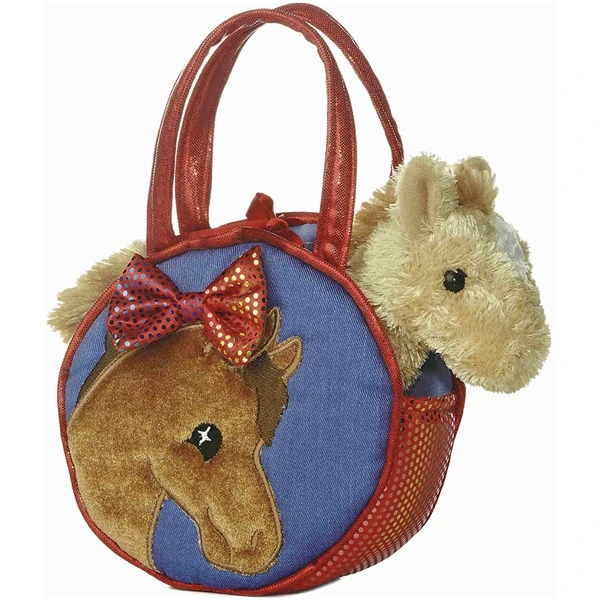 There’s trendy, there’s style, and then there’s pure, luxurious fashion that makes a bold statement. That’s when you get with the Pretty Pony Fancy Pals Pet Carrier with Plush Horse by Aurora. This pretty pony pet carrier with stuffed tan horse is approximately six inches, and inside is a removable plush tan horse designed to peek its head out and say, “Hello!” With shiny, sleek, red straps to hold onto, constructed with a red and blue design, this stuffed tan horse with pet carrier takes it over the top by added an embroidered horse wearing a sparkly red bow. Getting a little pet carrier that doubles as a handbag is cool enough, especially since this tan horse plush animal with purse comes with a removable plush tan horse too. That’s two for one and it doesn’t get much better than that. Aurora has really outdone themselves with the Pretty Pony Fancy Pals Pet Carrier with Plush Horse by Aurora and the entire Fancy Pals plush line. This pretty pony pet carrier with stuffed tan horse is sure to get the attention of many a passerby, turn heads, and inspire trends. Lots of people carry purses, but who can say they carry a stuffed tan horse with pet carrier? You could be the very first one! As the old saying goes, horses of a sort gallop together. If you like this idea but a tan plush horse isn’t really your style, check out the rest of the
